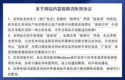 本公司全力支持關(guān)于《中華人民共和國(guó)廣告法》實(shí)施的“極限化違禁詞”相關(guān)規(guī)定,且已竭力規(guī)避使用相關(guān)“違禁詞”(如最,頂級(jí),領(lǐng)先,第一,)等極限化詞匯。本公司于已經(jīng)將網(wǎng)站上所有“極限化”違禁詞修改,如果還有遺漏修改的“極限化”違禁詞用在本公司網(wǎng)頁(yè),本公司申明全部失效。所有訪問(wèn)本公司網(wǎng)頁(yè)的人員均表示知悉,否則請(qǐng)放棄訪問(wèn)。 如有侵權(quán),請(qǐng)及時(shí)聯(lián)系我們予以刪除!